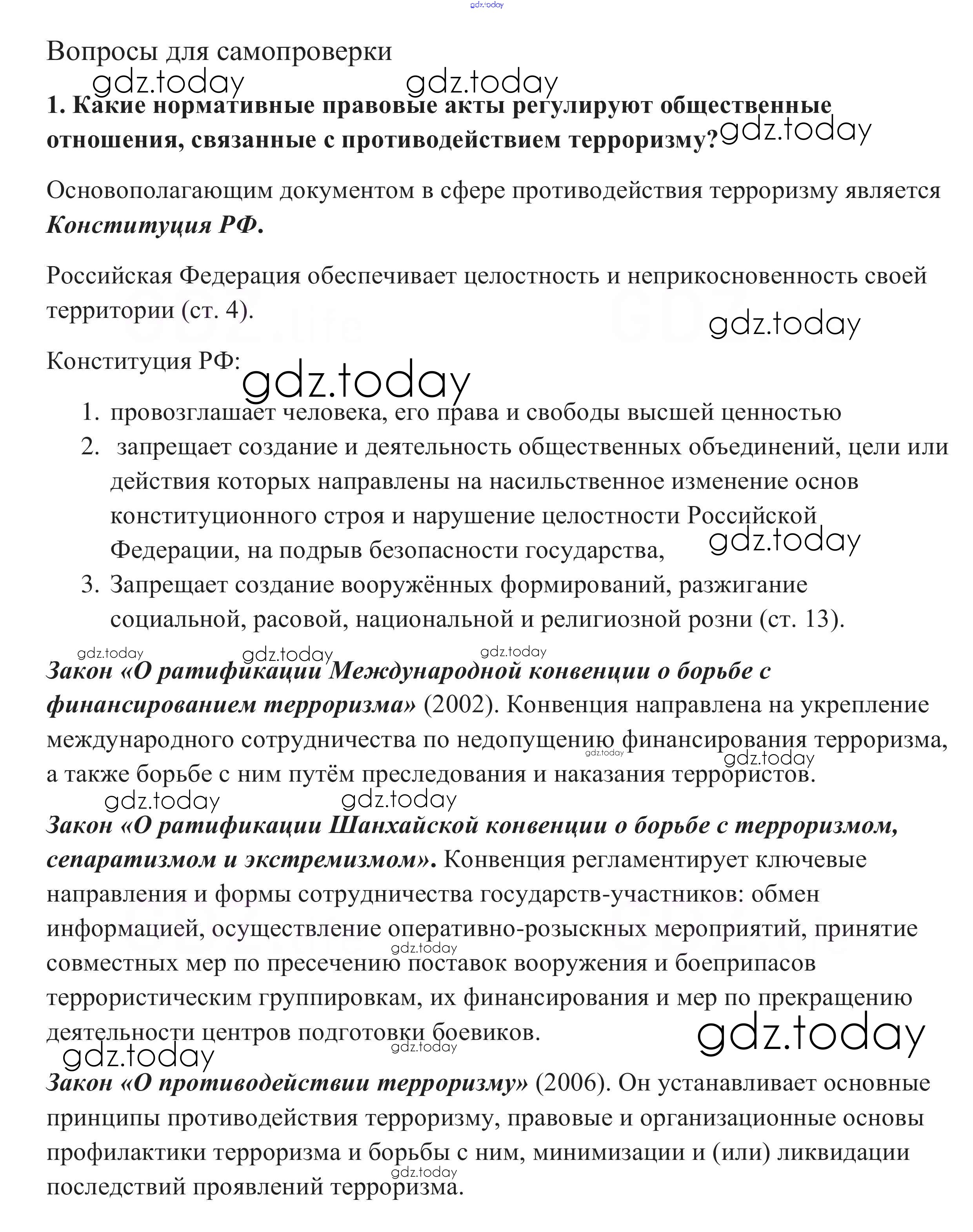 На страницах сайта gdz.today вы найдете учебный и вспомогательный материал, направленный на улучшения знаний школьной программы. ГДЗ - онлайн мир знаний Вопросы для самопроверки §30. Правовые основы антитеррористической политики РФ 1 Учебнику по Обществознанию для 10 класса Боголюбов, Аверьянов Базовый уровень Просвещение 2015