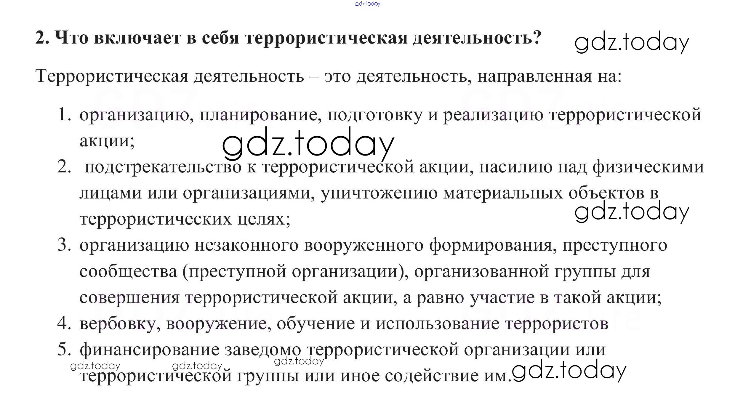 На страницах сайта gdz.today вы найдете учебный и вспомогательный материал, направленный на улучшения знаний школьной программы. ГДЗ - онлайн мир знаний Вопросы для самопроверки §30. Правовые основы антитеррористической политики РФ 2 Учебнику по Обществознанию для 10 класса Боголюбов, Аверьянов Базовый уровень Просвещение 2015