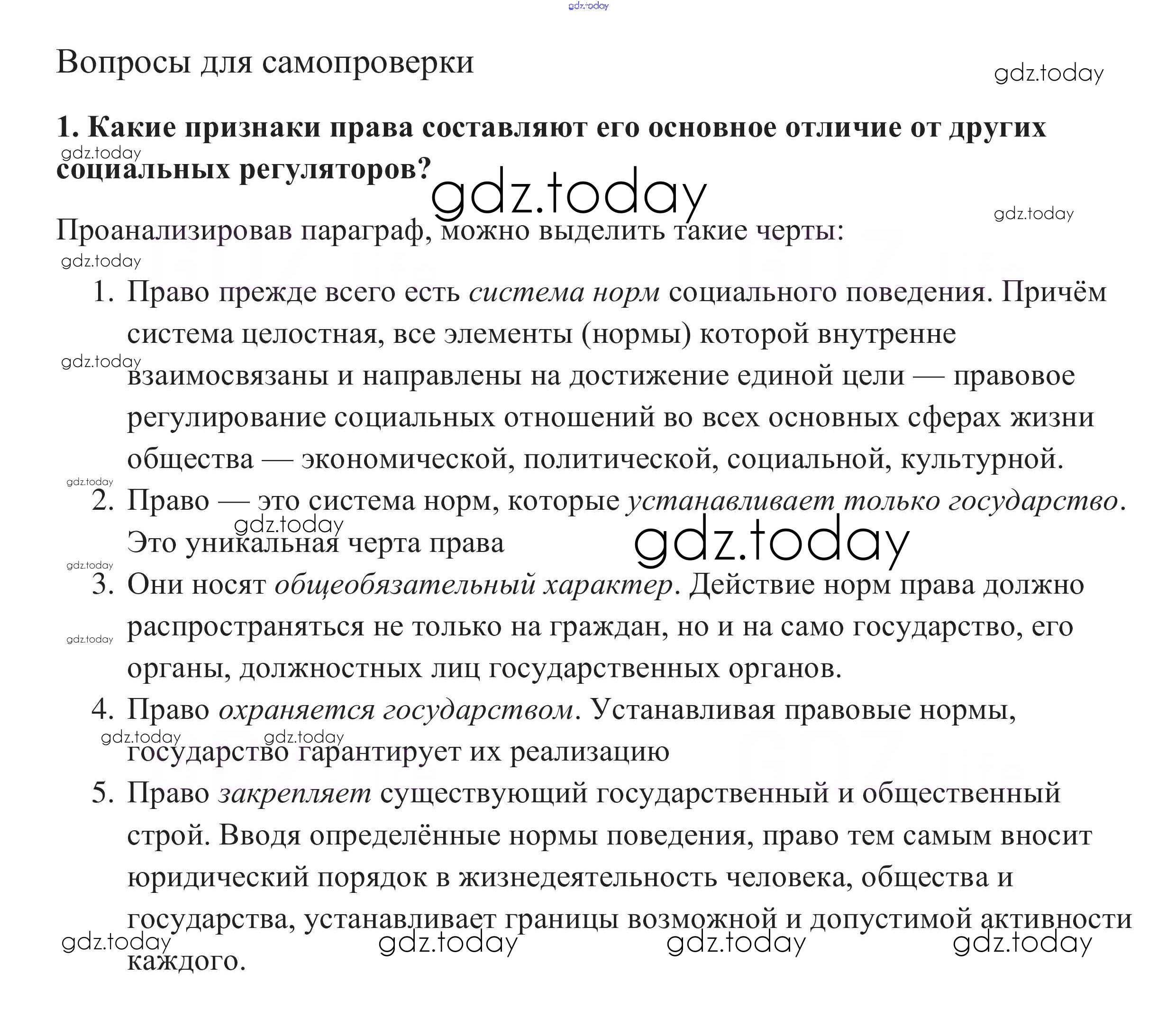 На страницах сайта gdz.today вы найдете учебный и вспомогательный материал, направленный на улучшения знаний школьной программы. ГДЗ - онлайн мир знаний Вопросы для самопроверки §18. Право в системе социальных норм 1 Учебнику по Обществознанию для 10 класса Боголюбов, Аверьянов Базовый уровень Просвещение 2015