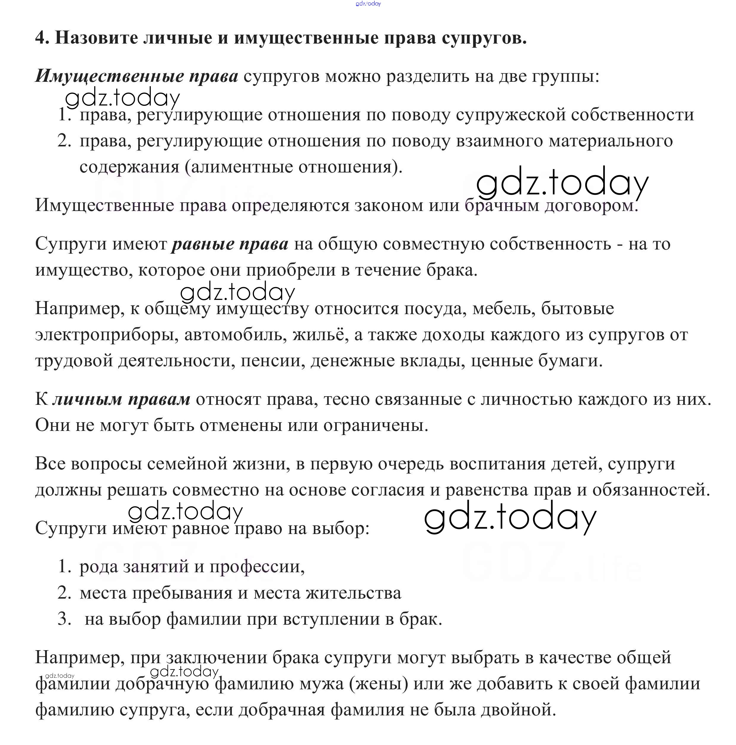 На страницах сайта gdz.today вы найдете учебный и вспомогательный материал, направленный на улучшения знаний школьной программы. ГДЗ - онлайн мир знаний Вопросы для самопроверки §24. Семейное право 4 Учебнику по Обществознанию для 10 класса Боголюбов, Аверьянов Базовый уровень Просвещение 2015