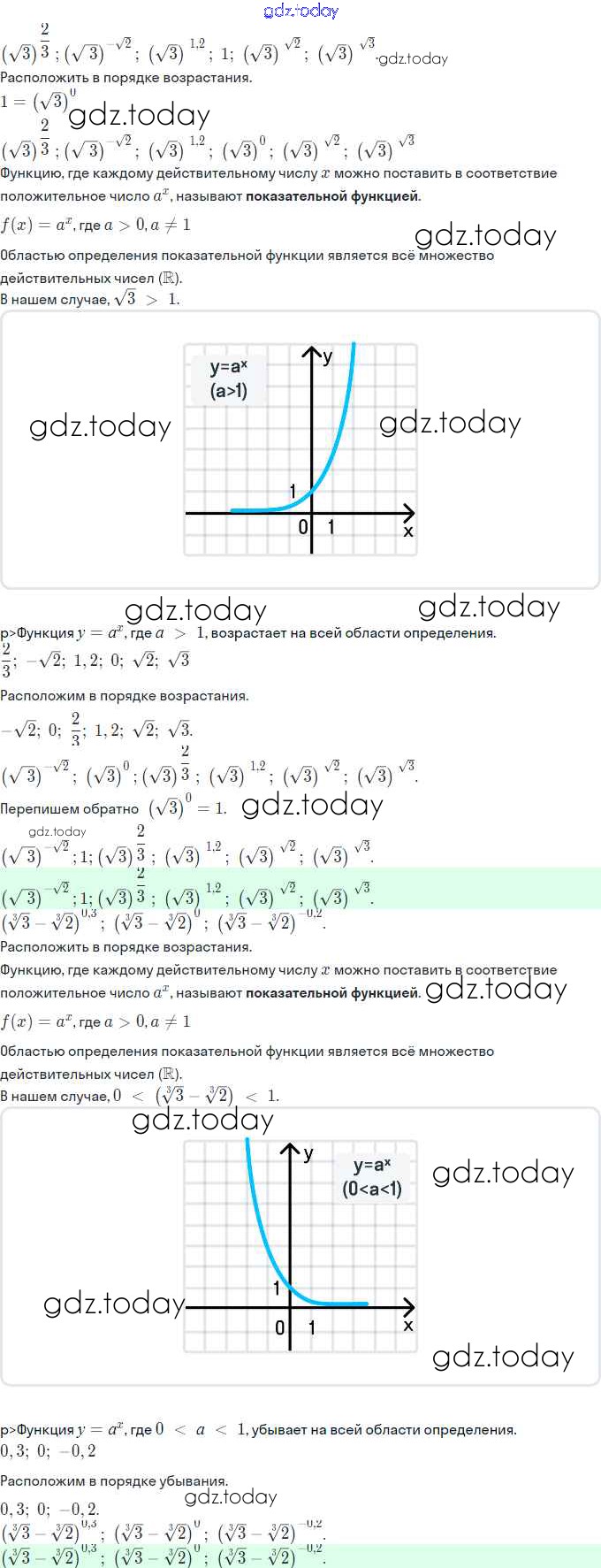 На страницах сайта gdz.today вы найдете учебный и вспомогательный материал, направленный на улучшения знаний школьной программы. ГДЗ - онлайн мир знаний Решение. §11. Показательная функция, её свойства и график 11.24 Задачнику по Алгебре для 11 класса Мордкович, Семёнов Базовый и углубленный уровень Мнемозина 2017
