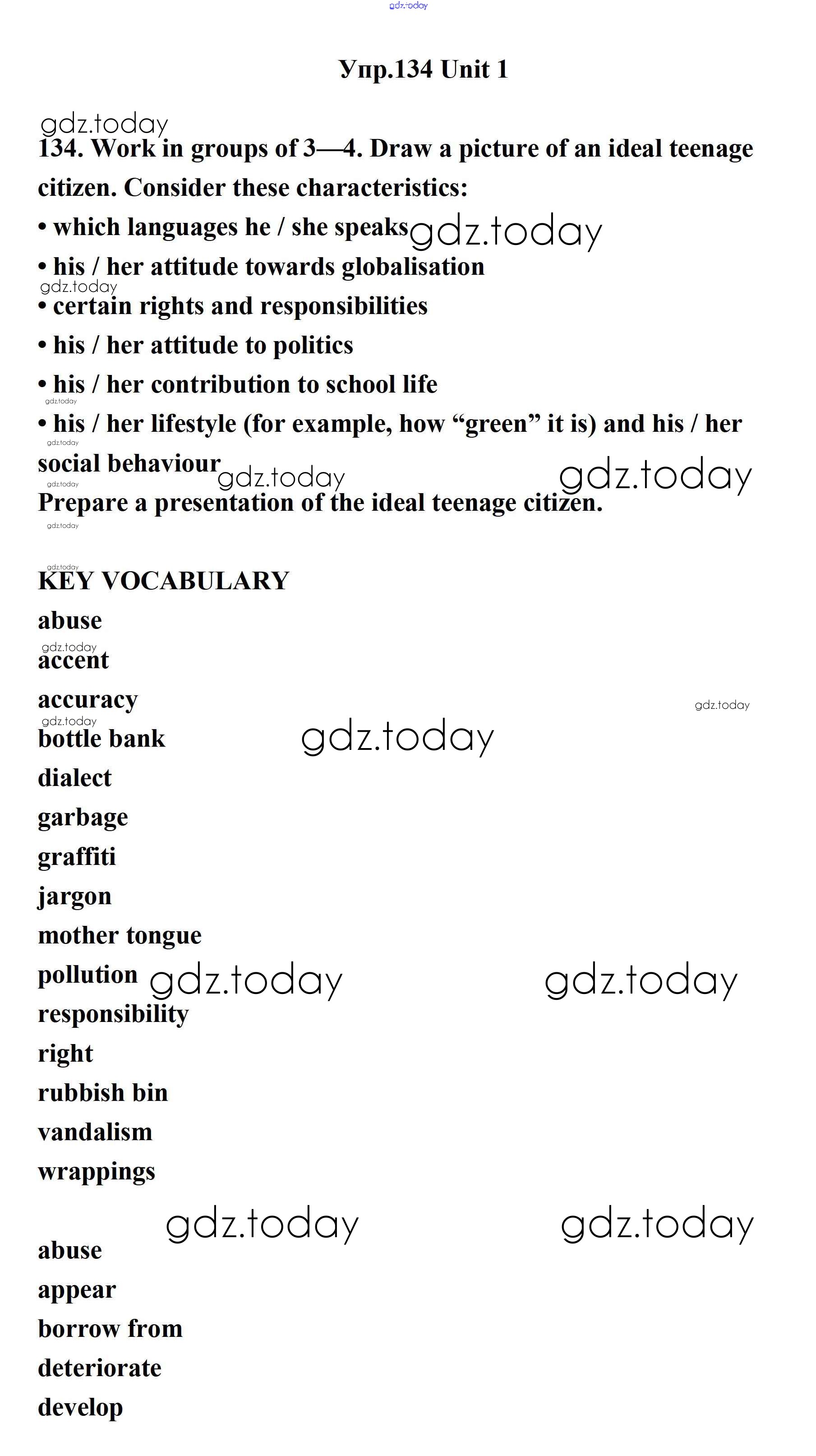На страницах сайта gdz.today вы найдете учебный и вспомогательный материал, направленный на улучшения знаний школьной программы. ГДЗ - онлайн мир знаний Решение. Unit 1. Young People in Society 134 Учебнику по Английскому языку для 11 класса Биболетова, Бабушис Дрофа Enjoy English 2017