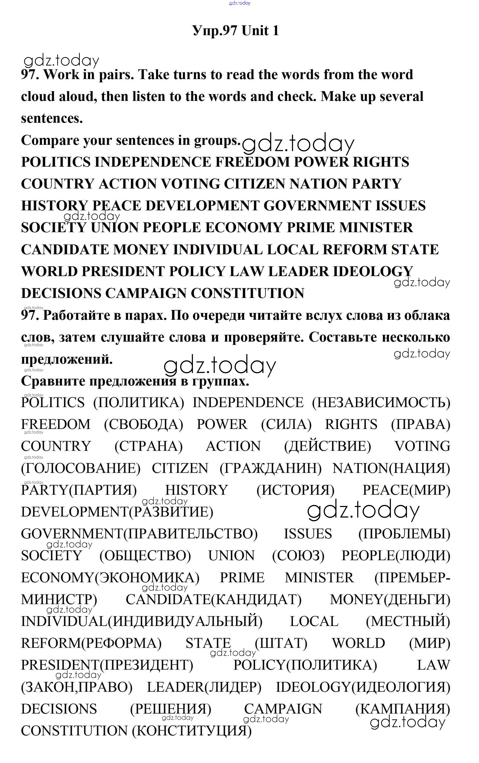 На страницах сайта gdz.today вы найдете учебный и вспомогательный материал, направленный на улучшения знаний школьной программы. ГДЗ - онлайн мир знаний Решение. Unit 1. Young People in Society  97 Учебнику по Английскому языку для 11 класса Биболетова, Бабушис  Дрофа Enjoy English 2017