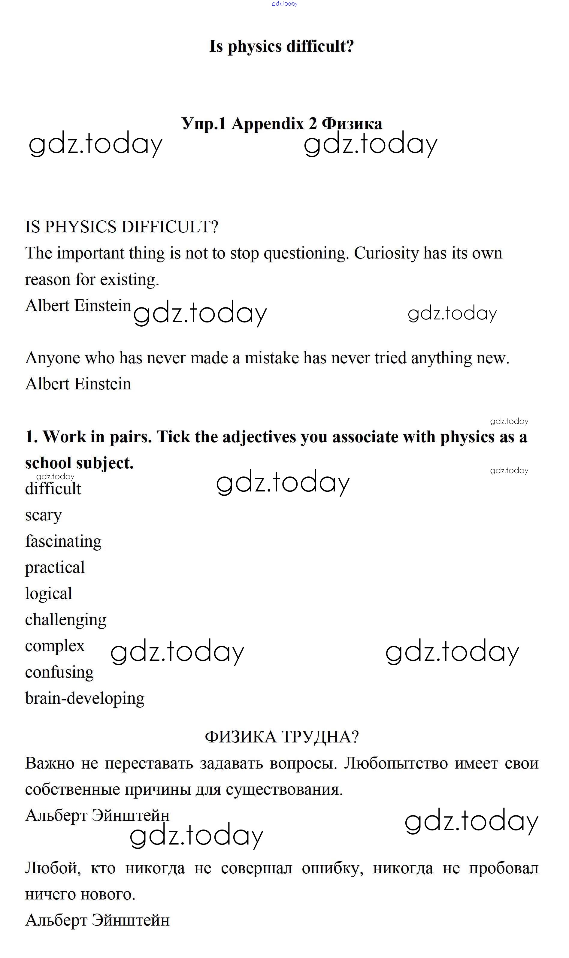 На страницах сайта gdz.today вы найдете учебный и вспомогательный материал, направленный на улучшения знаний школьной программы. ГДЗ - онлайн мир знаний Is physics difficult? Решение. Appendix 2 1 Учебнику по Английскому языку для 11 класса Биболетова, Бабушис Дрофа Enjoy English 2017