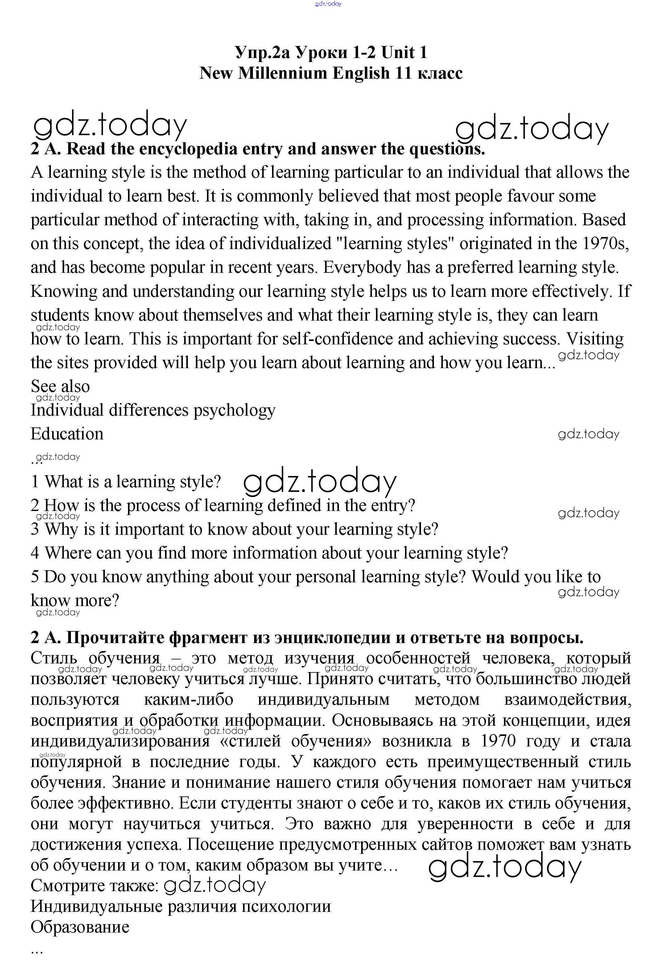 На страницах сайта gdz.today вы найдете учебный и вспомогательный материал, направленный на улучшения знаний школьной программы. ГДЗ - онлайн мир знаний lesson 1-2 Решение к Unit 1 2a Учебнику по Английскому языку для 11 класса Гроза, Дворецкая Титул New Millennium 2015