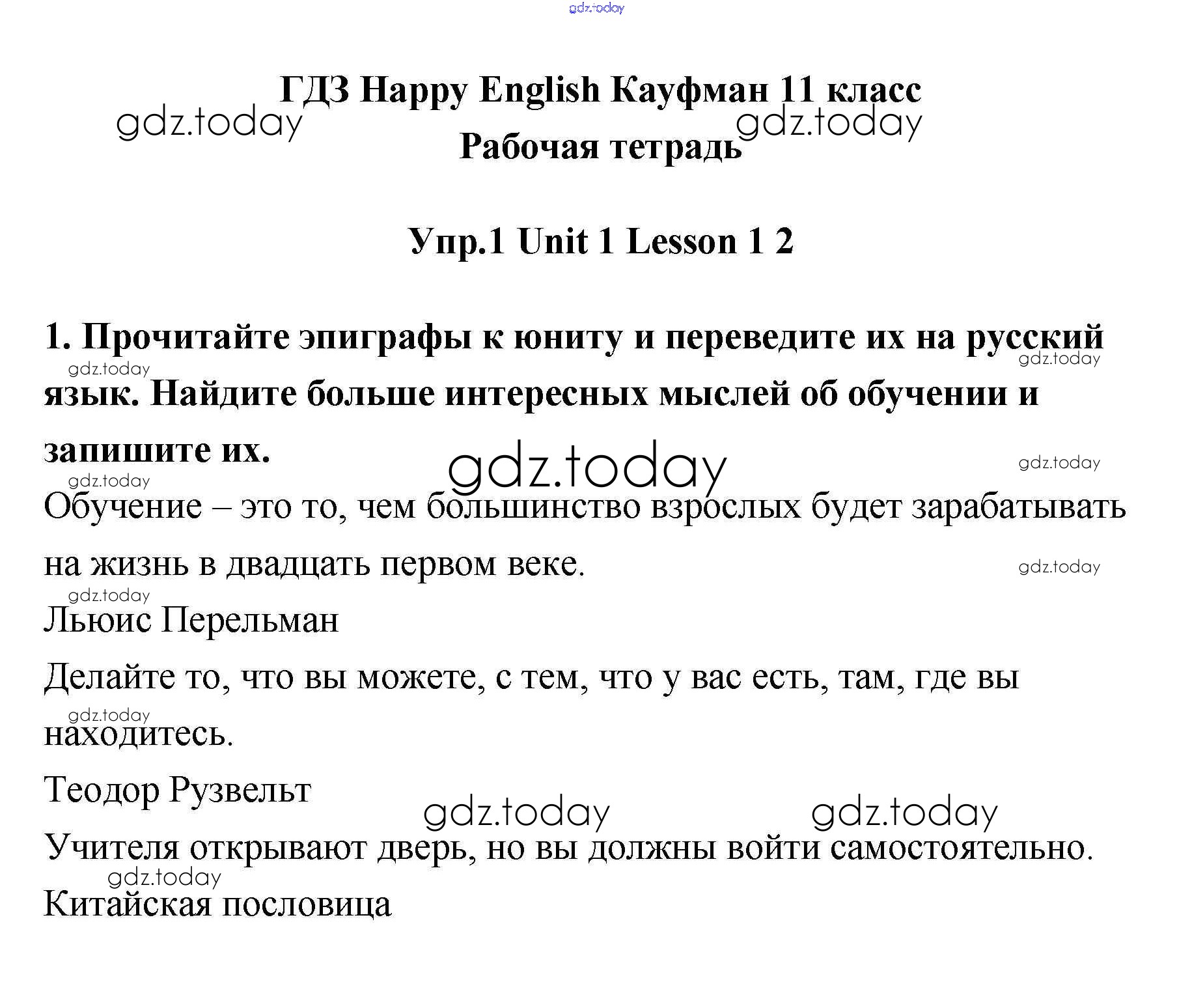 На страницах сайта gdz.today вы найдете учебный и вспомогательный материал, направленный на улучшения знаний школьной программы. ГДЗ - онлайн мир знаний Lesson 1, 2 Решение к Unit 1 1 Рабочей тетради по Английскому языку для 11 класса Кауфман  Титул Happy English 2014