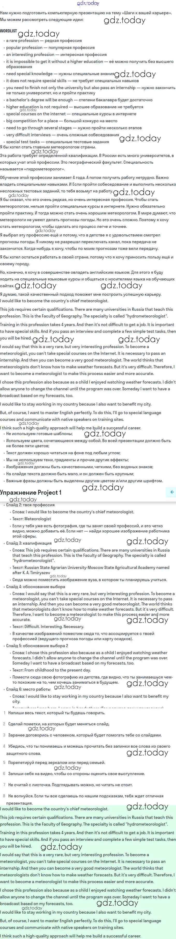 На страницах сайта gdz.today вы найдете учебный и вспомогательный материал, направленный на улучшения знаний школьной программы. ГДЗ - онлайн мир знаний Step 10 Решение. Unit 1. Steps to your career Project Учебнику по Английскому языку для 11 класса Афанасьева, Михеева Базовый уровень Дрофа, Просвещение Rainbow 2017, 2021