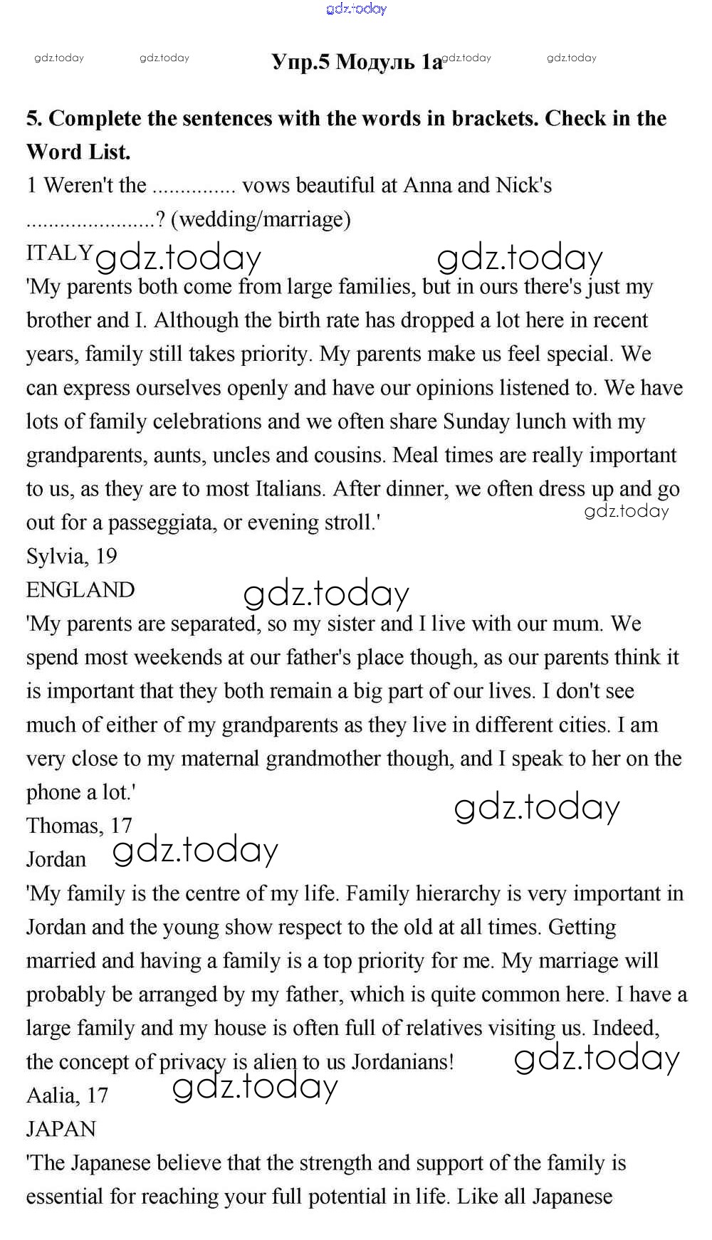 На страницах сайта gdz.today вы найдете учебный и вспомогательный материал, направленный на улучшения знаний школьной программы. ГДЗ - онлайн мир знаний Часть 1a Решение к Module 1 5 Учебнику по Английскому языку для 11 класса Эванс, Дули Просвещение Spotlight 2015