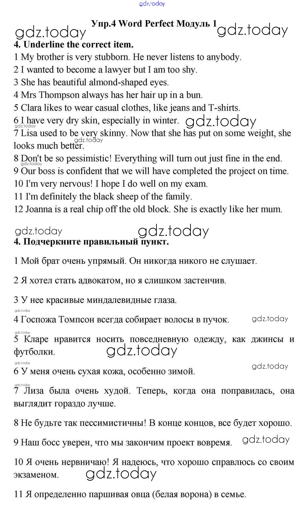 На страницах сайта gdz.today вы найдете учебный и вспомогательный материал, направленный на улучшения знаний школьной программы. ГДЗ - онлайн мир знаний Module 1 Решение к Work Perfect 4 Учебнику по Английскому языку для 11 класса Эванс, Дули  Просвещение Spotlight 2015