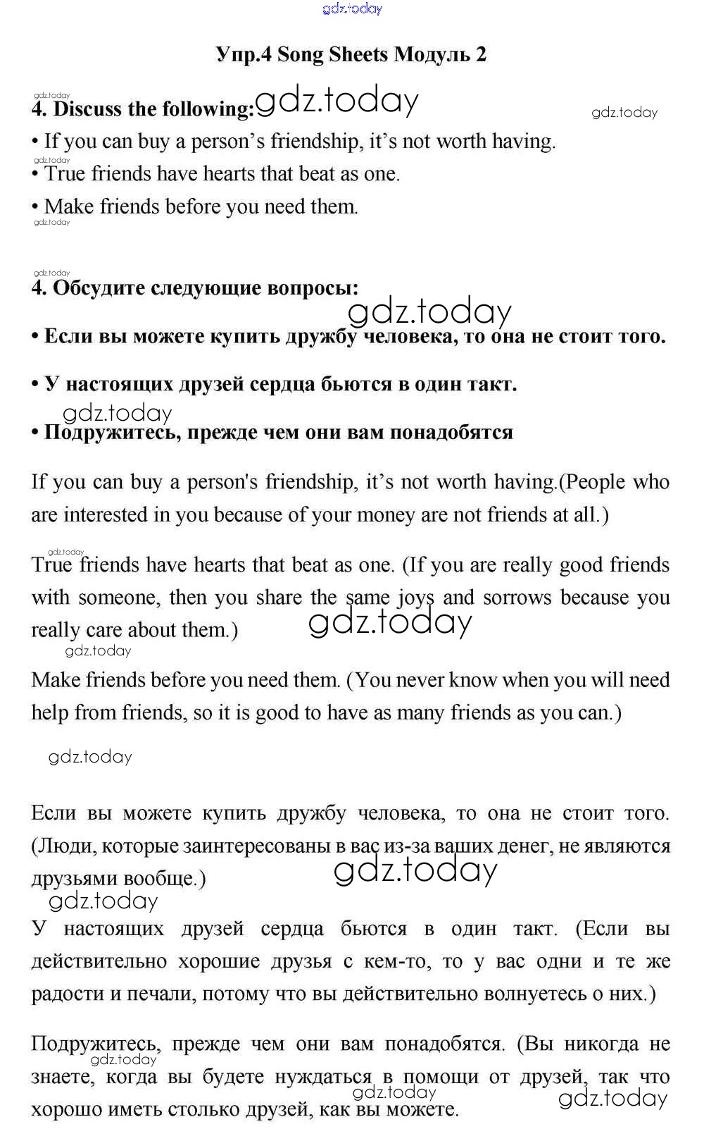 На страницах сайта gdz.today вы найдете учебный и вспомогательный материал, направленный на улучшения знаний школьной программы. ГДЗ - онлайн мир знаний Module 2 Решение к Song Sheets 4 Учебнику по Английскому языку для 11 класса Эванс, Дули Просвещение Spotlight 2015
