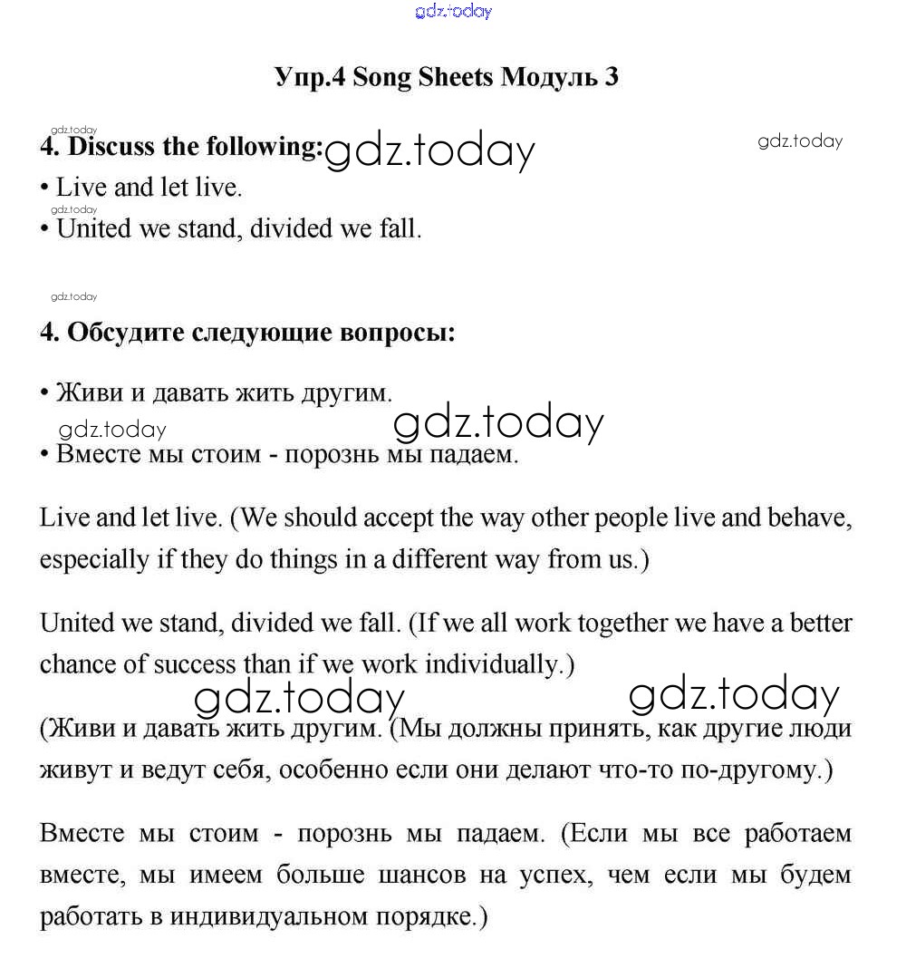 На страницах сайта gdz.today вы найдете учебный и вспомогательный материал, направленный на улучшения знаний школьной программы. ГДЗ - онлайн мир знаний Module 3 Решение к Song Sheets 4 Учебнику по Английскому языку для 11 класса Эванс, Дули Просвещение Spotlight 2015
