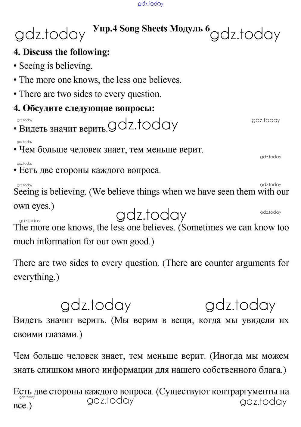 На страницах сайта gdz.today вы найдете учебный и вспомогательный материал, направленный на улучшения знаний школьной программы. ГДЗ - онлайн мир знаний Module 6 Решение к Song Sheets 4 Учебнику по Английскому языку для 11 класса Эванс, Дули  Просвещение Spotlight 2015