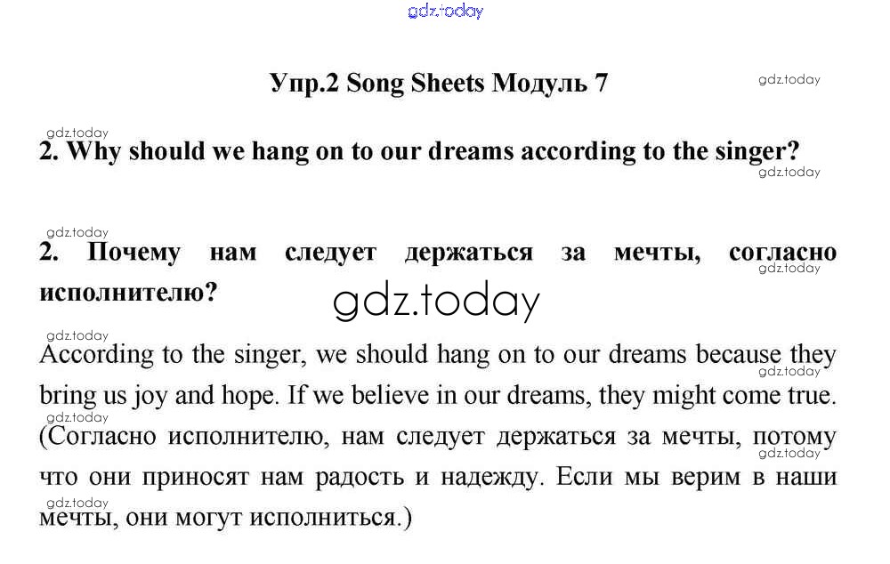 На страницах сайта gdz.today вы найдете учебный и вспомогательный материал, направленный на улучшения знаний школьной программы. ГДЗ - онлайн мир знаний Module 7 Решение к Song Sheets 2 Учебнику по Английскому языку для 11 класса Эванс, Дули Просвещение Spotlight 2015