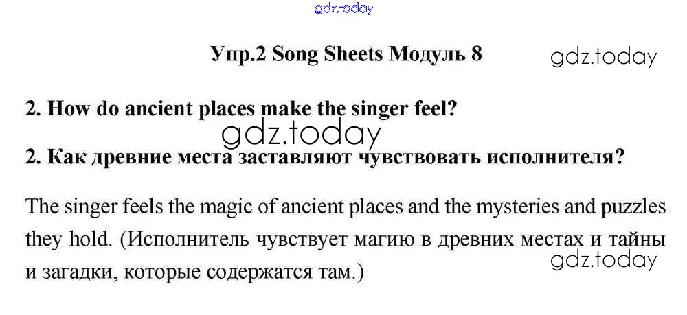 На страницах сайта gdz.today вы найдете учебный и вспомогательный материал, направленный на улучшения знаний школьной программы. ГДЗ - онлайн мир знаний Module 8 Решение к Song Sheets 2 Учебнику по Английскому языку для 11 класса Эванс, Дули Просвещение Spotlight 2015