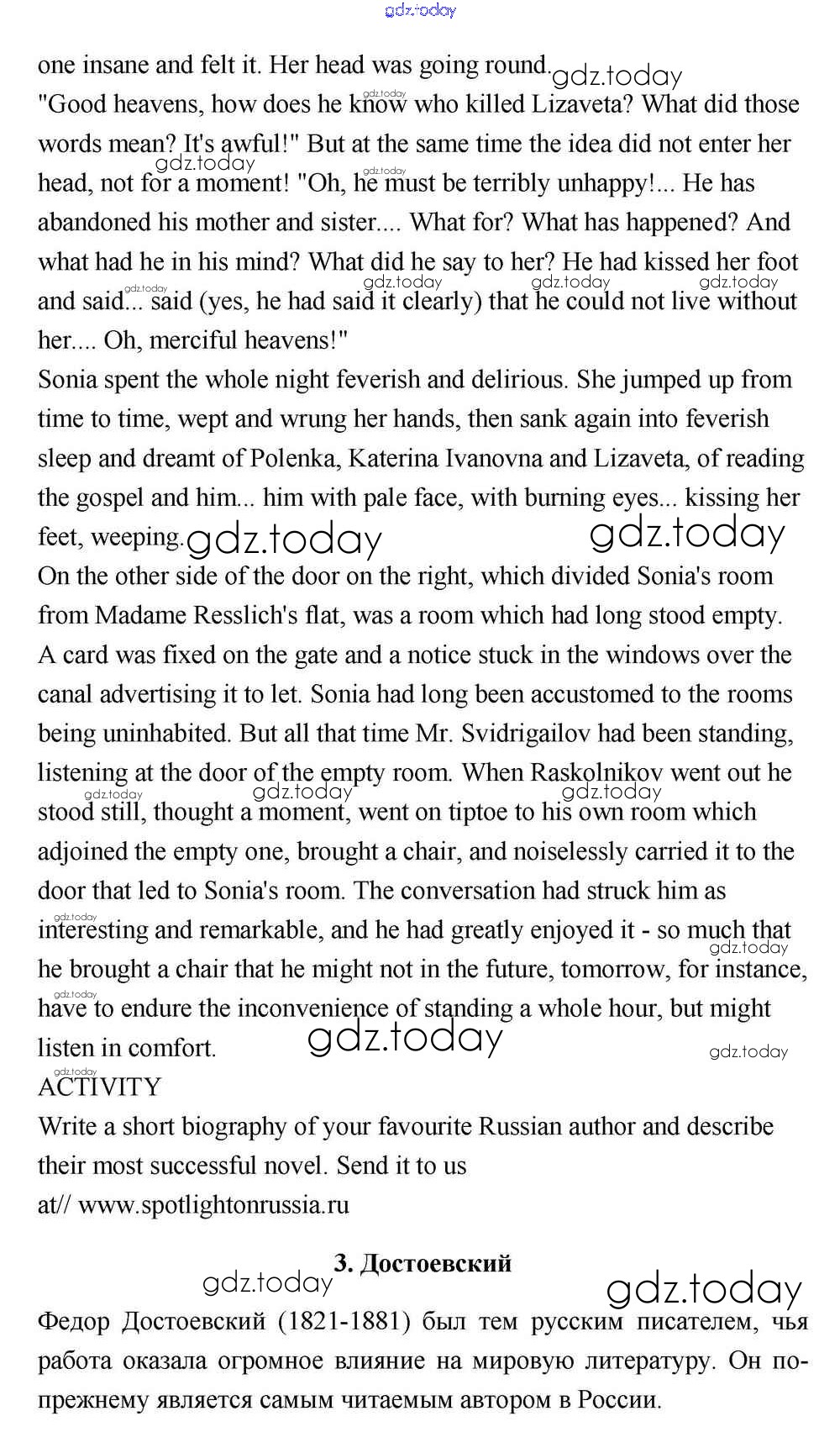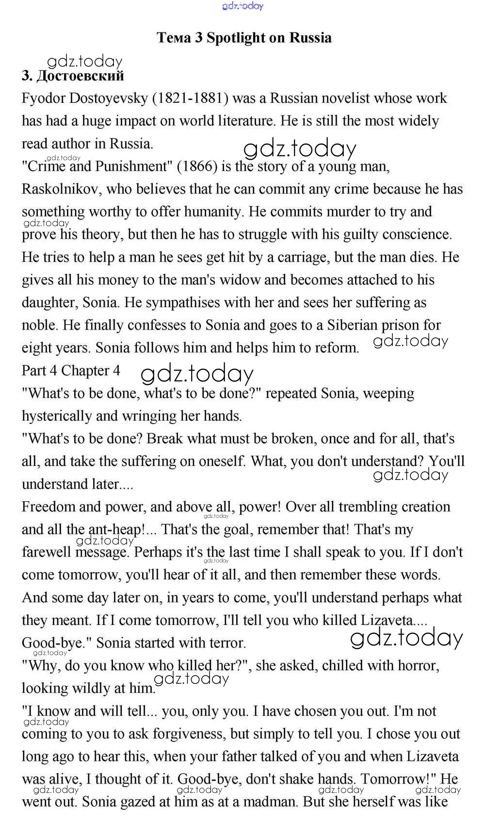 На страницах сайта gdz.today вы найдете учебный и вспомогательный материал, направленный на улучшения знаний школьной программы. ГДЗ - онлайн мир знаний Решение к Spotlight on Russia  Dostoevsky (стр.5) Учебнику по Английскому языку для 11 класса Эванс, Дули  Просвещение Spotlight 2015