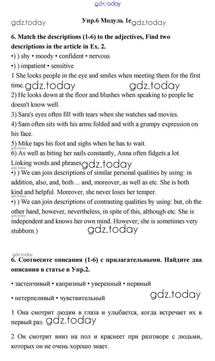 На страницах сайта gdz.today вы найдете учебный и вспомогательный материал, направленный на улучшения знаний школьной программы. ГДЗ - онлайн мир знаний 1e Решение. Module 1. Relationships 6 Учебнику по Английскому языку для 11 класса Эванс, Дули Просвещение Spotlight 2015
