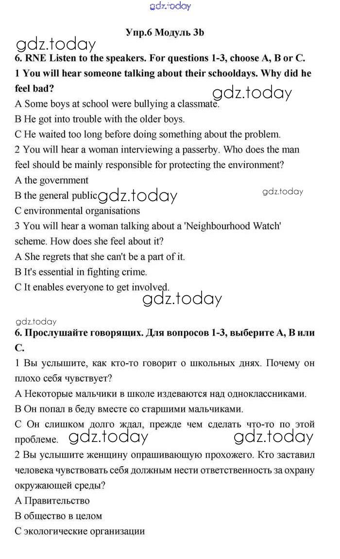 На страницах сайта gdz.today вы найдете учебный и вспомогательный материал, направленный на улучшения знаний школьной программы. ГДЗ - онлайн мир знаний 3b Решение. Module 3. Responsibility 6 Учебнику по Английскому языку для 11 класса Эванс, Дули Просвещение Spotlight 2015