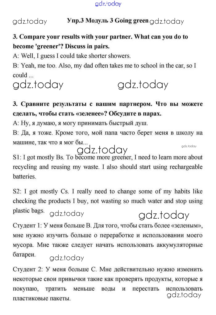 На страницах сайта gdz.today вы найдете учебный и вспомогательный материал, направленный на улучшения знаний школьной программы. ГДЗ - онлайн мир знаний Going green Решение. Module 3. Responsibility 3 Учебнику по Английскому языку для 11 класса Эванс, Дули Просвещение Spotlight 2015