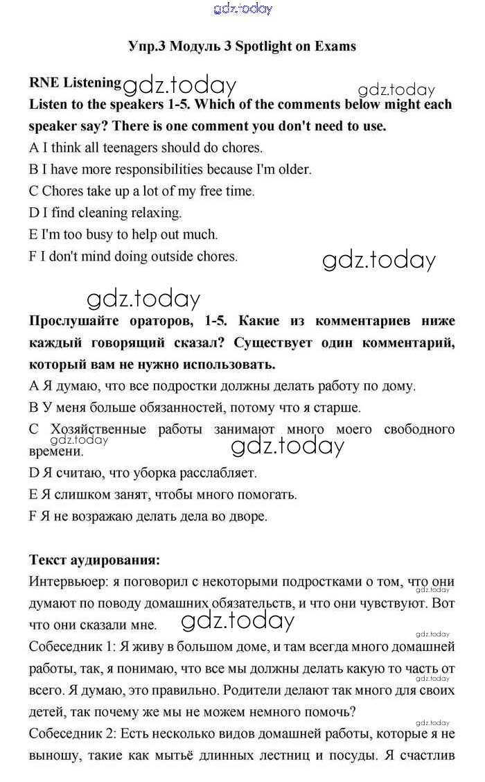 На страницах сайта gdz.today вы найдете учебный и вспомогательный материал, направленный на улучшения знаний школьной программы. ГДЗ - онлайн мир знаний Spotlight on exams Решение. Module 3. Responsibility Listening Учебнику по Английскому языку для 11 класса Эванс, Дули Просвещение Spotlight 2015