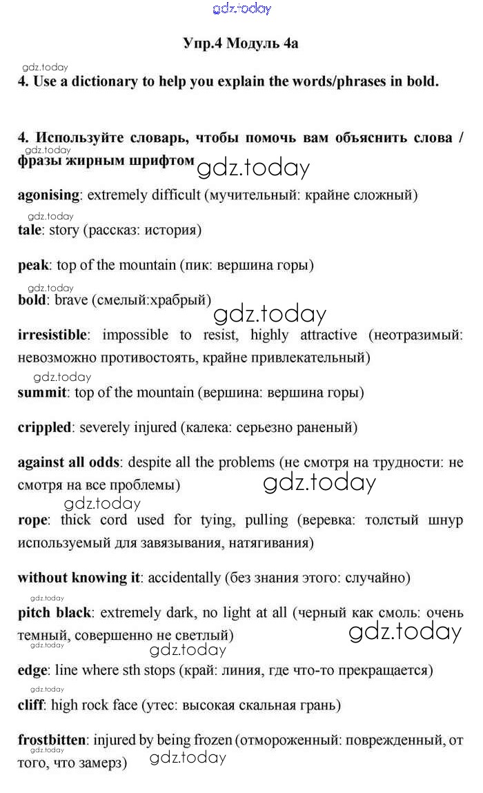 На страницах сайта gdz.today вы найдете учебный и вспомогательный материал, направленный на улучшения знаний школьной программы. ГДЗ - онлайн мир знаний 4a Решение. Module 4. Danger! 4 Учебнику по Английскому языку для 11 класса Эванс, Дули Просвещение Spotlight 2015