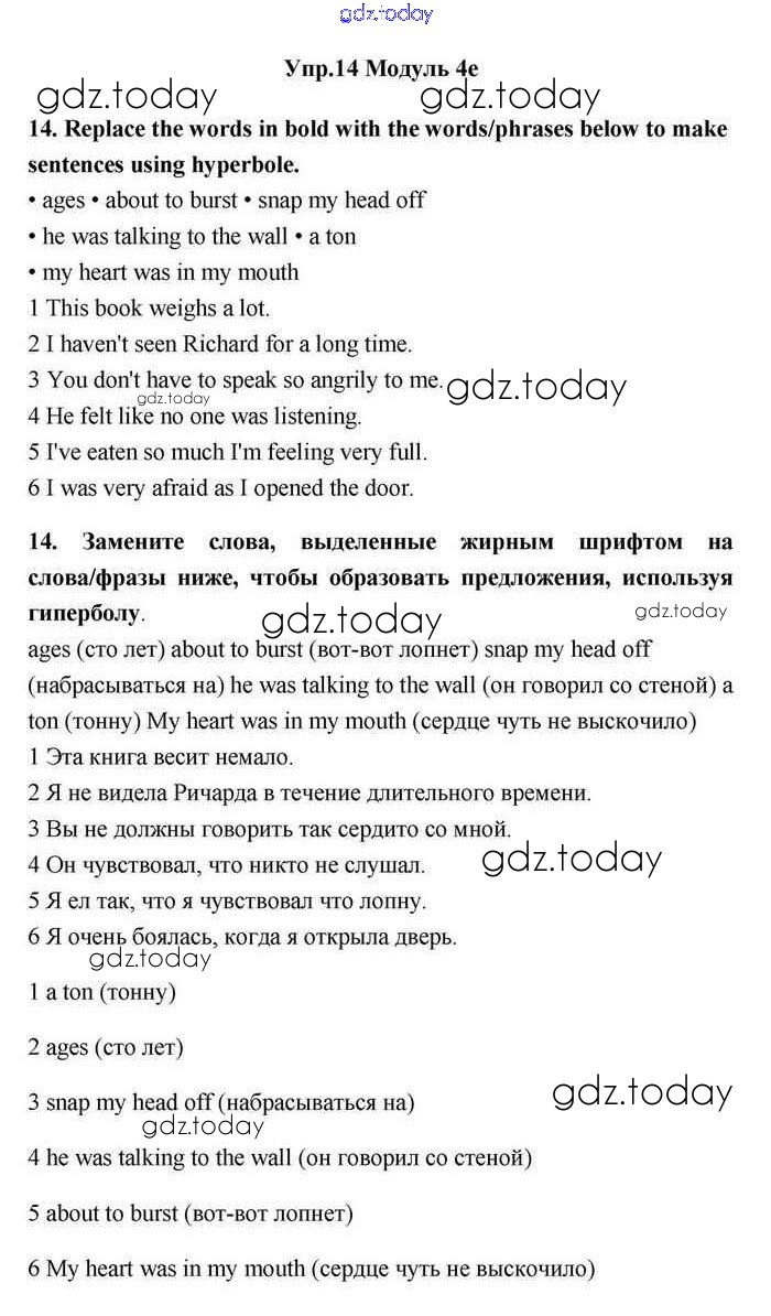 На страницах сайта gdz.today вы найдете учебный и вспомогательный материал, направленный на улучшения знаний школьной программы. ГДЗ - онлайн мир знаний 4e Решение. Module 4. Danger! 14 Учебнику по Английскому языку для 11 класса Эванс, Дули Просвещение Spotlight 2015