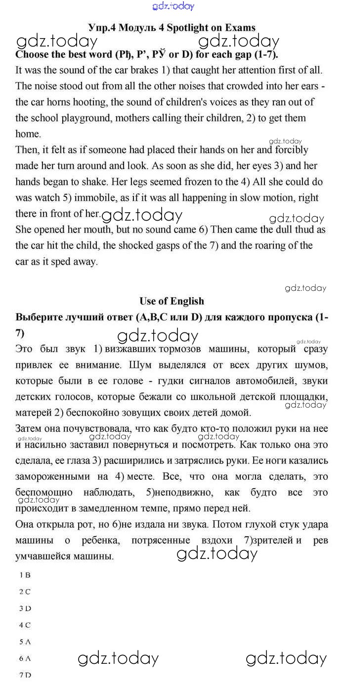 На страницах сайта gdz.today вы найдете учебный и вспомогательный материал, направленный на улучшения знаний школьной программы. ГДЗ - онлайн мир знаний Spotlight on exams Решение. Module 4. Danger! Use of English Учебнику по Английскому языку для 11 класса Эванс, Дули Просвещение Spotlight 2015