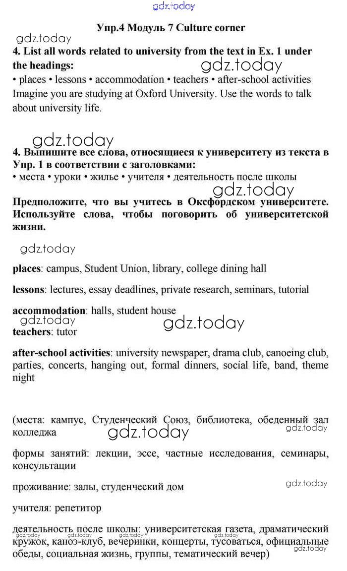 На страницах сайта gdz.today вы найдете учебный и вспомогательный материал, направленный на улучшения знаний школьной программы. ГДЗ - онлайн мир знаний Culture corner 7 Решение. Module 7. In days to come 4 Учебнику по Английскому языку для 11 класса Эванс, Дули Просвещение Spotlight 2015