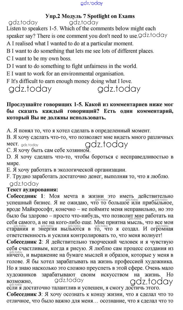 На страницах сайта gdz.today вы найдете учебный и вспомогательный материал, направленный на улучшения знаний школьной программы. ГДЗ - онлайн мир знаний Spotlight on exams Решение. Module 7. In days to come Listening Учебнику по Английскому языку для 11 класса Эванс, Дули Просвещение Spotlight 2015