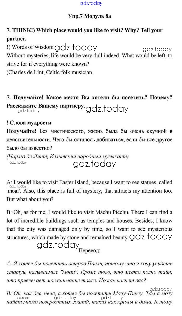 На страницах сайта gdz.today вы найдете учебный и вспомогательный материал, направленный на улучшения знаний школьной программы. ГДЗ - онлайн мир знаний 8a Решение. Module 8. Travel 7 Учебнику по Английскому языку для 11 класса Эванс, Дули Просвещение Spotlight 2015