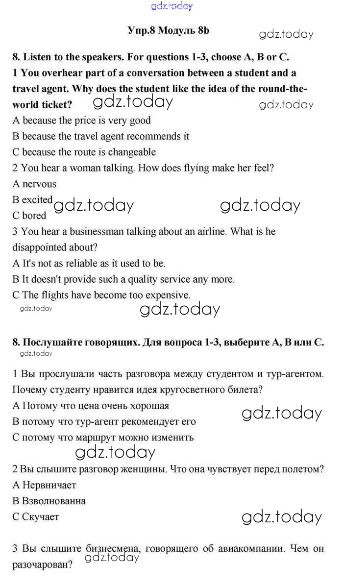 На страницах сайта gdz.today вы найдете учебный и вспомогательный материал, направленный на улучшения знаний школьной программы. ГДЗ - онлайн мир знаний 8b Решение. Module 8. Travel 8 Учебнику по Английскому языку для 11 класса Эванс, Дули Просвещение Spotlight 2015