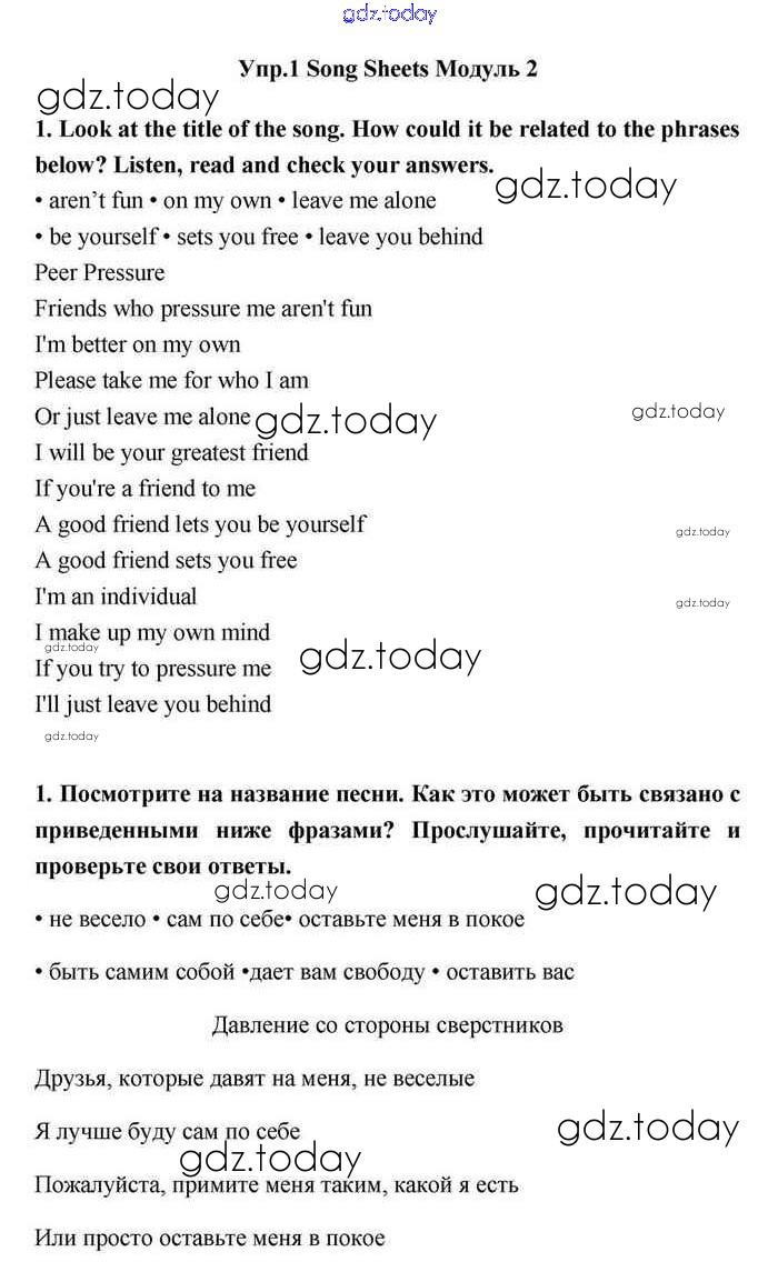 На страницах сайта gdz.today вы найдете учебный и вспомогательный материал, направленный на улучшения знаний школьной программы. ГДЗ - онлайн мир знаний Module 2 Решение. Song sheets 1 Учебнику по Английскому языку для 11 класса Эванс, Дули Просвещение Spotlight 2015