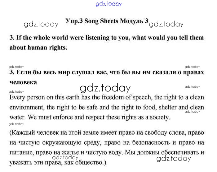 На страницах сайта gdz.today вы найдете учебный и вспомогательный материал, направленный на улучшения знаний школьной программы. ГДЗ - онлайн мир знаний Module 3 Решение. Song sheets 3 Учебнику по Английскому языку для 11 класса Эванс, Дули Просвещение Spotlight 2015