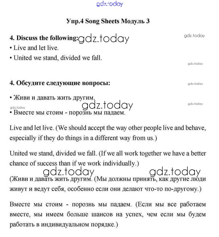 На страницах сайта gdz.today вы найдете учебный и вспомогательный материал, направленный на улучшения знаний школьной программы. ГДЗ - онлайн мир знаний Module 3 Решение. Song sheets 4 Учебнику по Английскому языку для 11 класса Эванс, Дули Просвещение Spotlight 2015