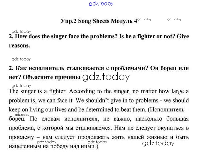 На страницах сайта gdz.today вы найдете учебный и вспомогательный материал, направленный на улучшения знаний школьной программы. ГДЗ - онлайн мир знаний Module 4 Решение. Song sheets 2 Учебнику по Английскому языку для 11 класса Эванс, Дули Просвещение Spotlight 2015