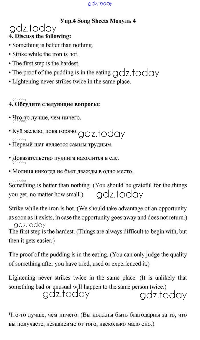На страницах сайта gdz.today вы найдете учебный и вспомогательный материал, направленный на улучшения знаний школьной программы. ГДЗ - онлайн мир знаний Module 4 Решение. Song sheets 4 Учебнику по Английскому языку для 11 класса Эванс, Дули Просвещение Spotlight 2015