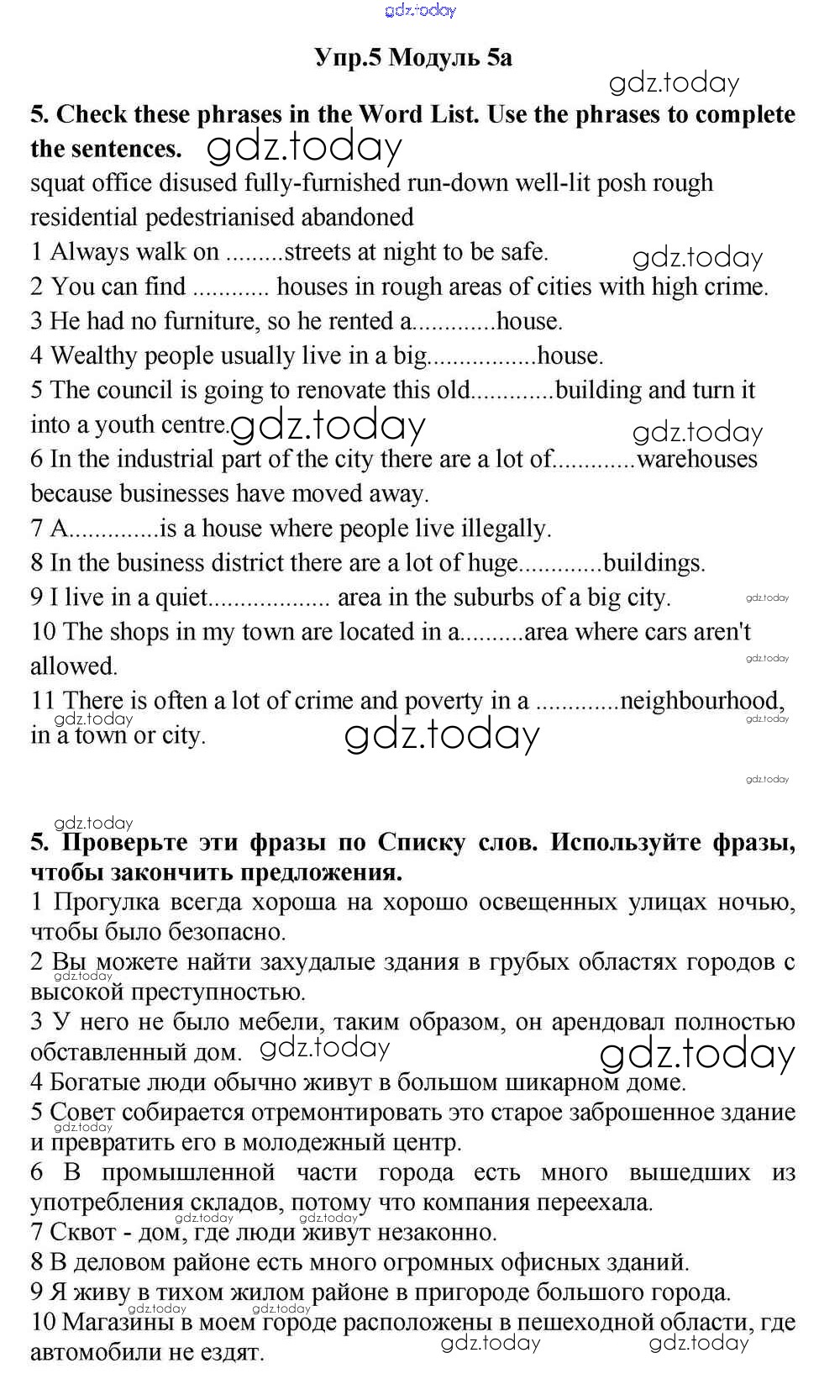 На страницах сайта gdz.today вы найдете учебный и вспомогательный материал, направленный на улучшения знаний школьной программы. ГДЗ - онлайн мир знаний Часть 5а Решение к Module 5 5 Учебнику по Английскому языку для 11 класса Эванс, Дули Просвещение Spotlight 2015