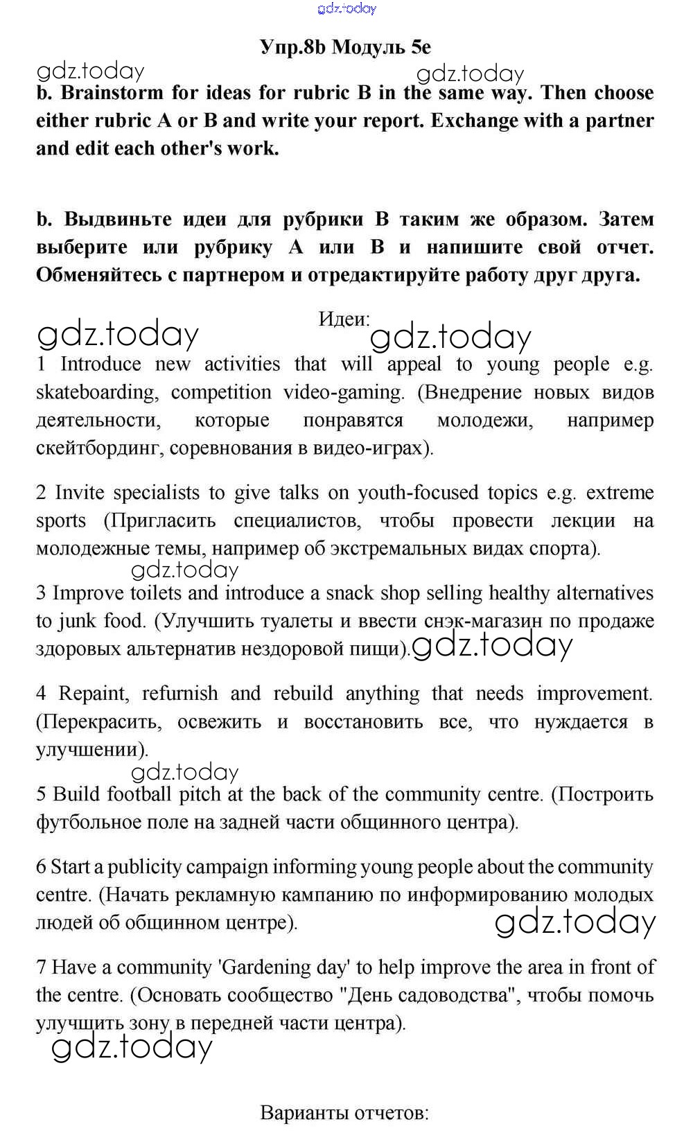 На страницах сайта gdz.today вы найдете учебный и вспомогательный материал, направленный на улучшения знаний школьной программы. ГДЗ - онлайн мир знаний Часть 5e Решение к Module 5 8b Учебнику по Английскому языку для 11 класса Эванс, Дули Просвещение Spotlight 2015