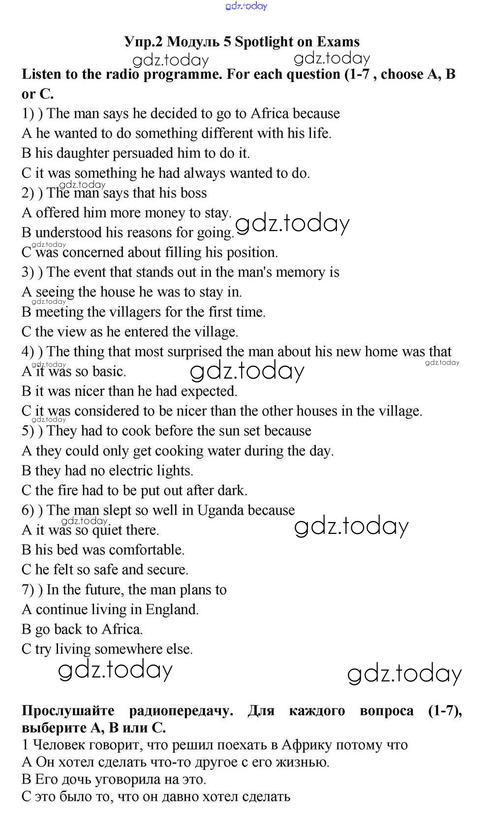На страницах сайта gdz.today вы найдете учебный и вспомогательный материал, направленный на улучшения знаний школьной программы. ГДЗ - онлайн мир знаний Spotlight on Exams Решение к Module 5 2 Учебнику по Английскому языку для 11 класса Эванс, Дули  Просвещение Spotlight 2015