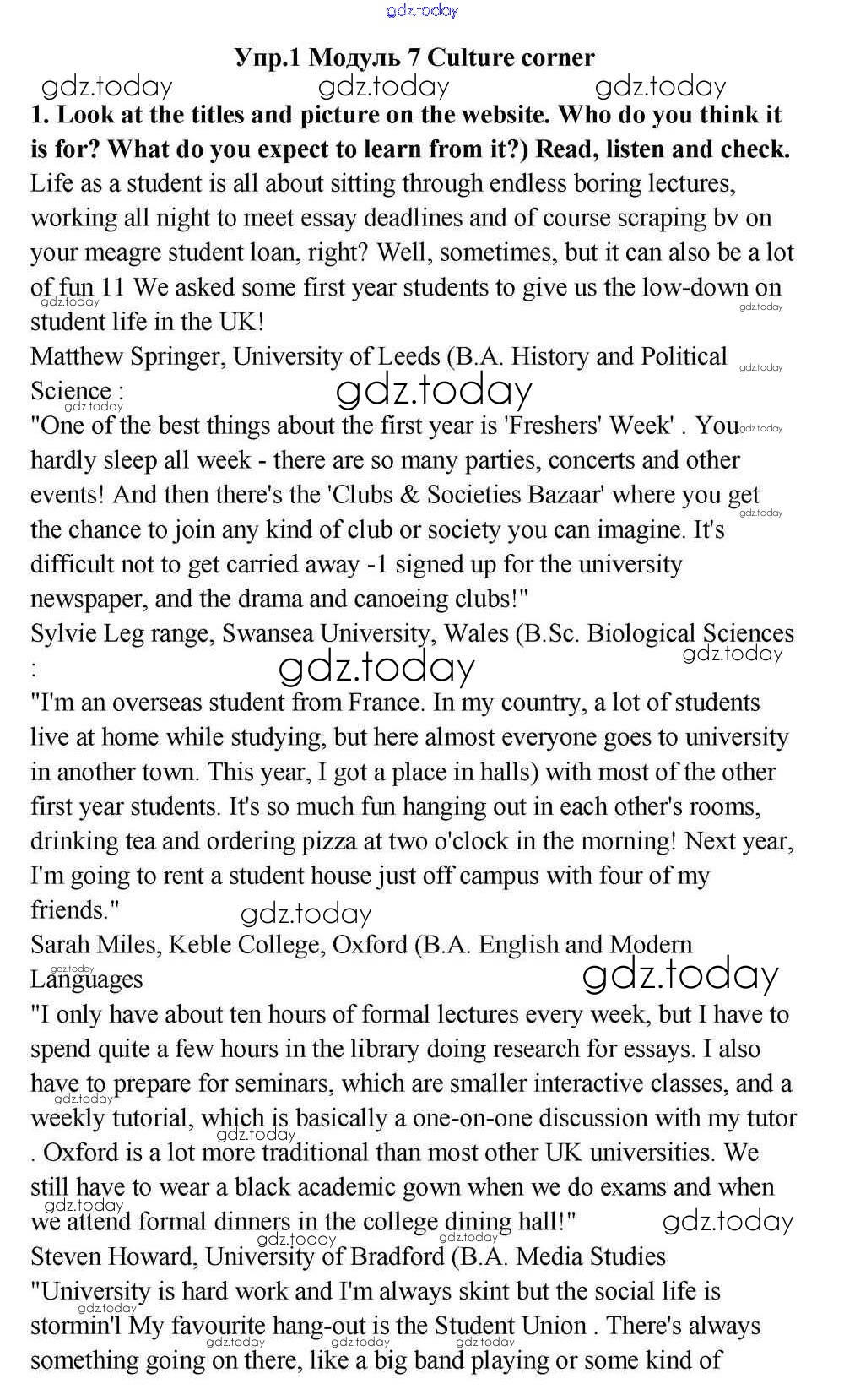 На страницах сайта gdz.today вы найдете учебный и вспомогательный материал, направленный на улучшения знаний школьной программы. ГДЗ - онлайн мир знаний Culture corner Решение к Module 7 1 Учебнику по Английскому языку для 11 класса Эванс, Дули  Просвещение Spotlight 2015