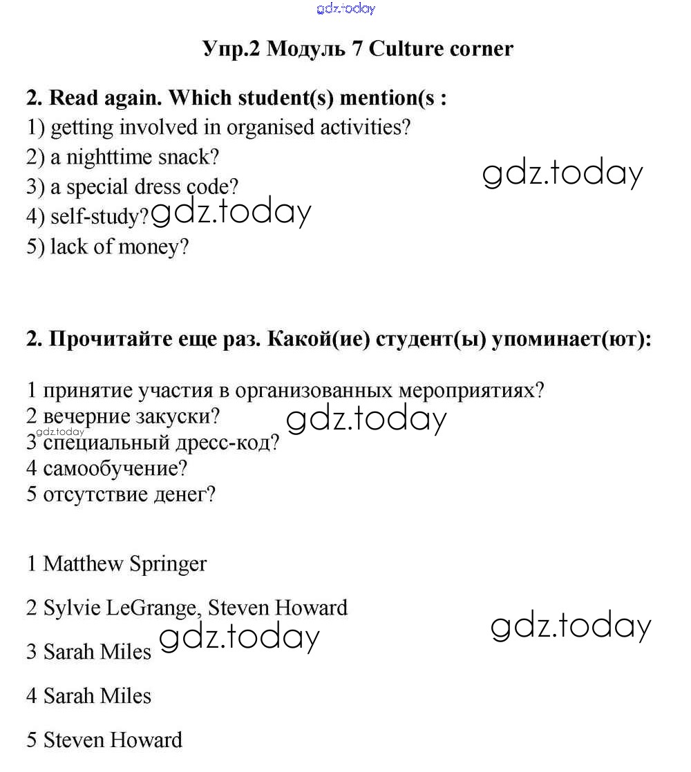 На страницах сайта gdz.today вы найдете учебный и вспомогательный материал, направленный на улучшения знаний школьной программы. ГДЗ - онлайн мир знаний Culture corner Решение к Module 7 2 Учебнику по Английскому языку для 11 класса Эванс, Дули  Просвещение Spotlight 2015
