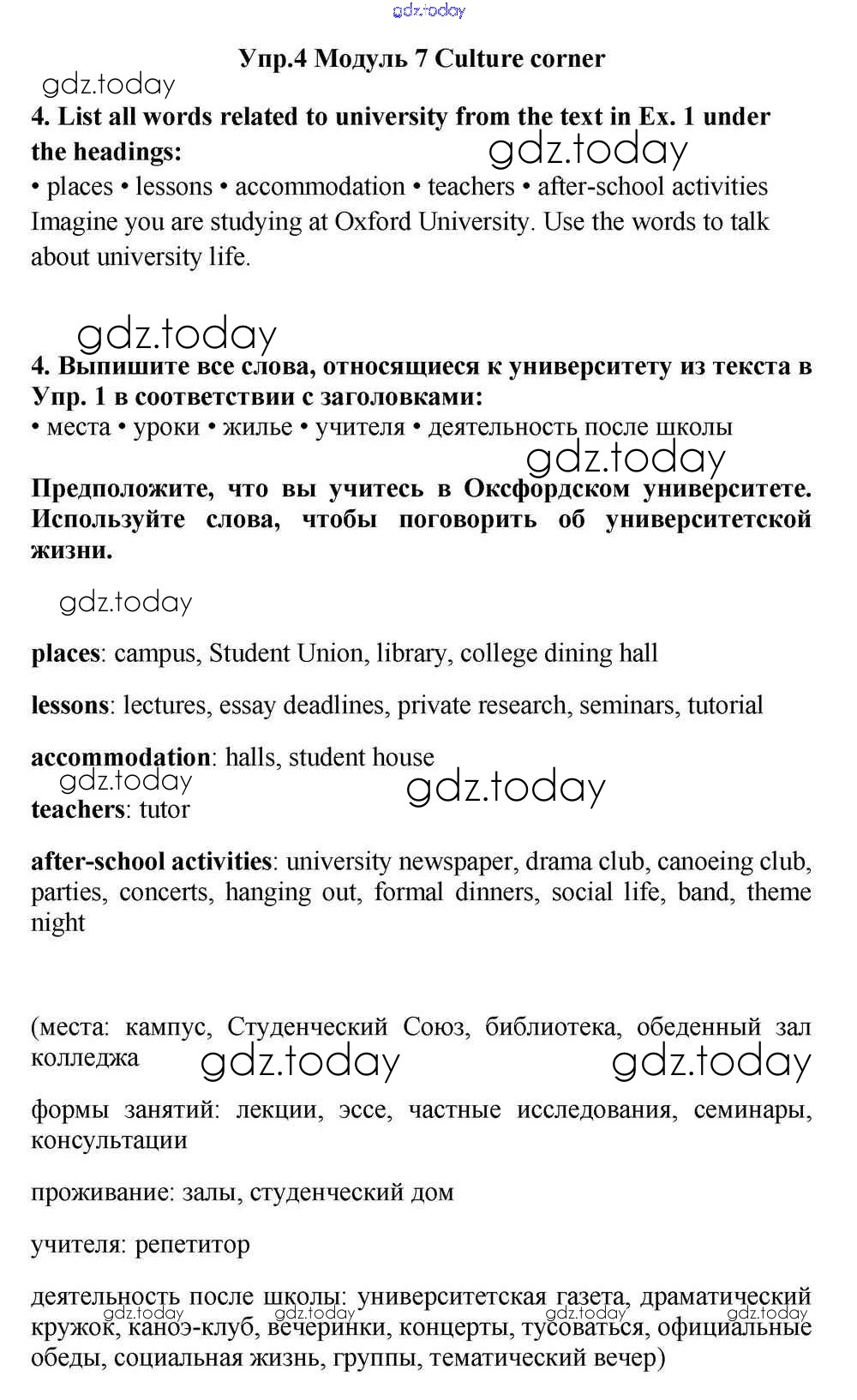 На страницах сайта gdz.today вы найдете учебный и вспомогательный материал, направленный на улучшения знаний школьной программы. ГДЗ - онлайн мир знаний Culture corner Решение к Module 7 4 Учебнику по Английскому языку для 11 класса Эванс, Дули  Просвещение Spotlight 2015