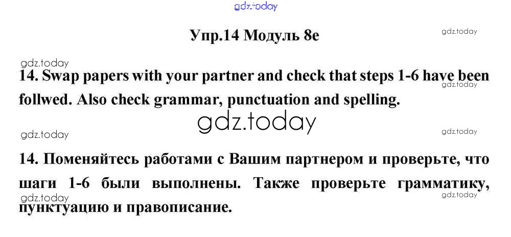 На страницах сайта gdz.today вы найдете учебный и вспомогательный материал, направленный на улучшения знаний школьной программы. ГДЗ - онлайн мир знаний Часть 8e Решение к Module 8 14 Учебнику по Английскому языку для 11 класса Эванс, Дули Просвещение Spotlight 2015