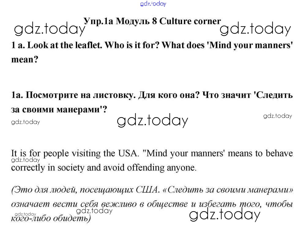 На страницах сайта gdz.today вы найдете учебный и вспомогательный материал, направленный на улучшения знаний школьной программы. ГДЗ - онлайн мир знаний Culture corner Решение к Module 8 1a Учебнику по Английскому языку для 11 класса Эванс, Дули Просвещение Spotlight 2015