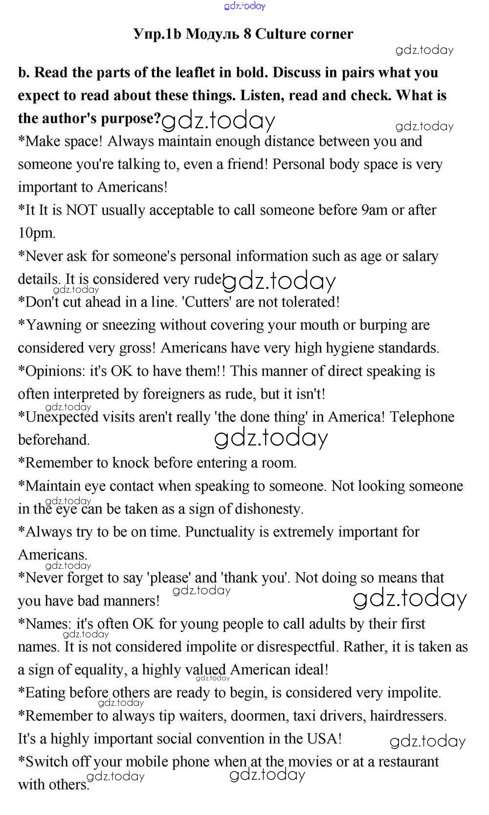 На страницах сайта gdz.today вы найдете учебный и вспомогательный материал, направленный на улучшения знаний школьной программы. ГДЗ - онлайн мир знаний Culture corner Решение к Module 8 1b Учебнику по Английскому языку для 11 класса Эванс, Дули Просвещение Spotlight 2015