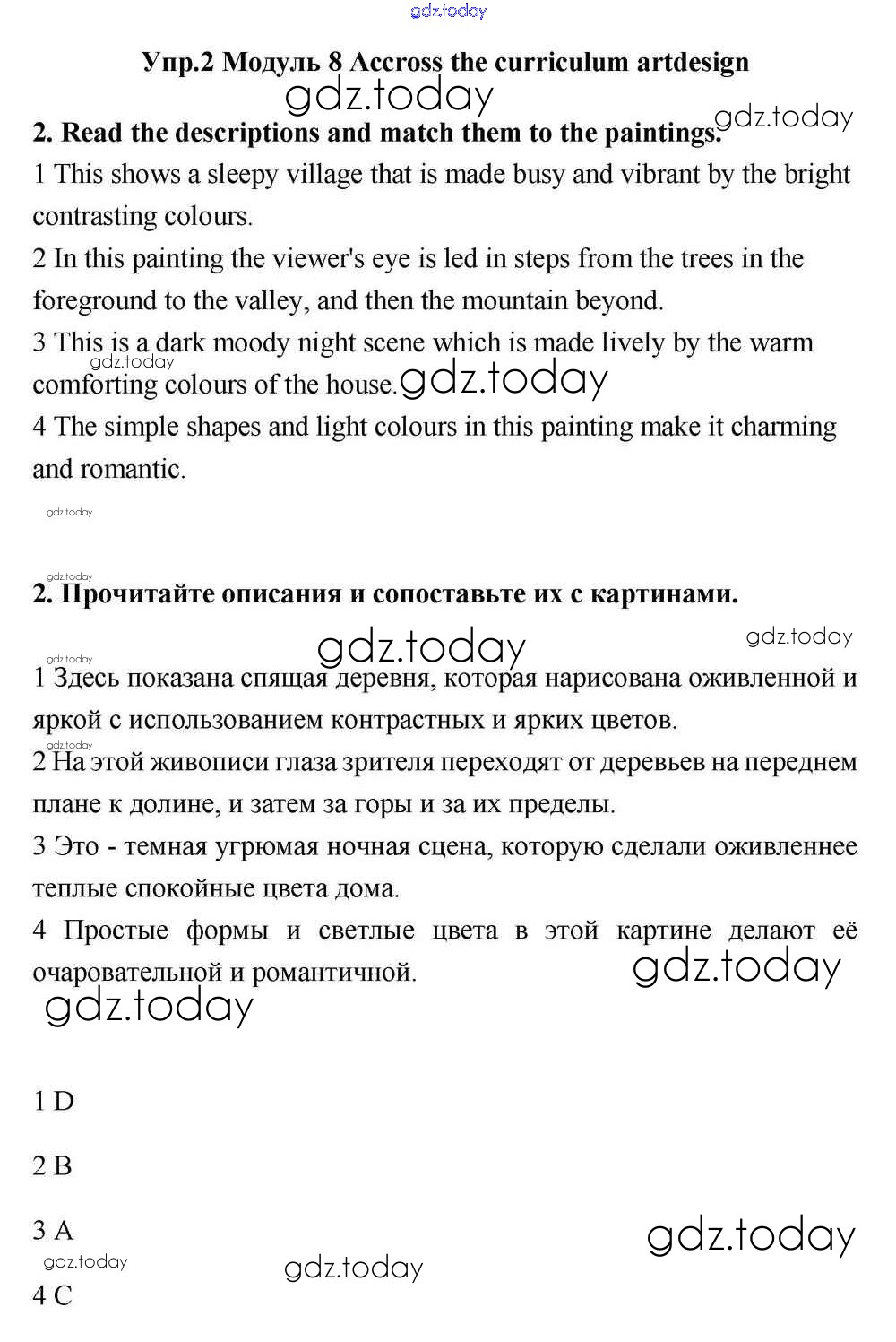 На страницах сайта gdz.today вы найдете учебный и вспомогательный материал, направленный на улучшения знаний школьной программы. ГДЗ - онлайн мир знаний Accross the curriculum art&design Решение к Module 8 2 Учебнику по Английскому языку для 11 класса Эванс, Дули Просвещение Spotlight 2015