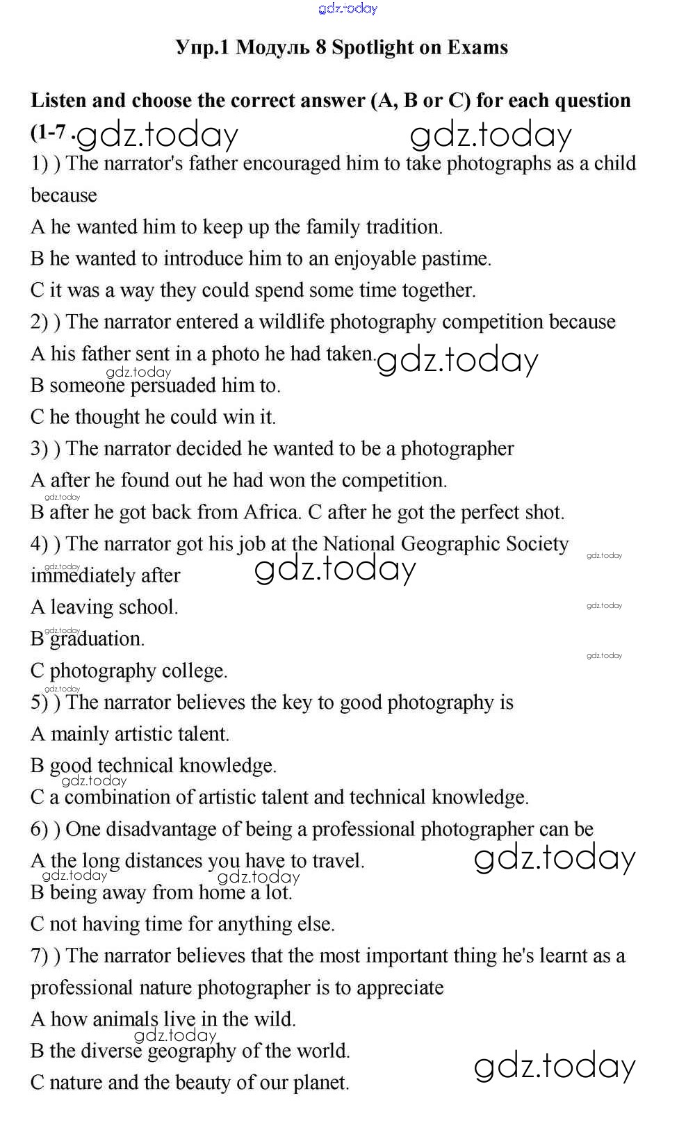 На страницах сайта gdz.today вы найдете учебный и вспомогательный материал, направленный на улучшения знаний школьной программы. ГДЗ - онлайн мир знаний Spotlight on Exams Решение к Module 8 1 Учебнику по Английскому языку для 11 класса Эванс, Дули  Просвещение Spotlight 2015