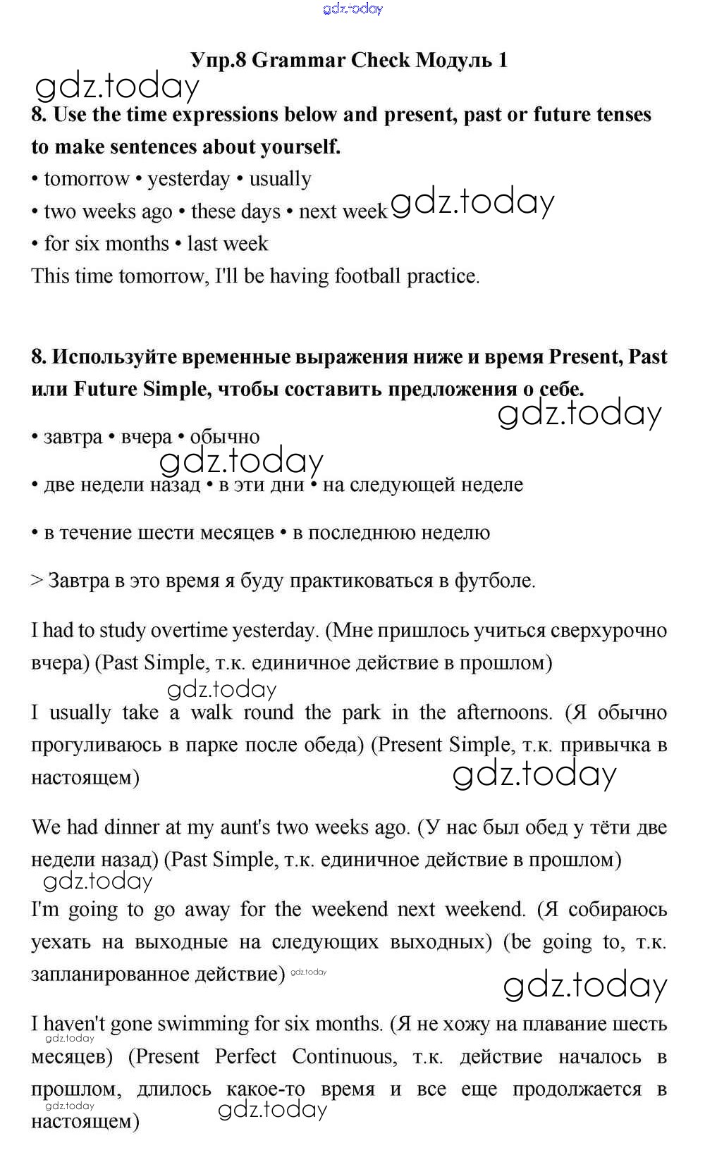На страницах сайта gdz.today вы найдете учебный и вспомогательный материал, направленный на улучшения знаний школьной программы. ГДЗ - онлайн мир знаний Module 1 Решение к Grammar Check 8 Учебнику по Английскому языку для 11 класса Эванс, Дули  Просвещение Spotlight 2015