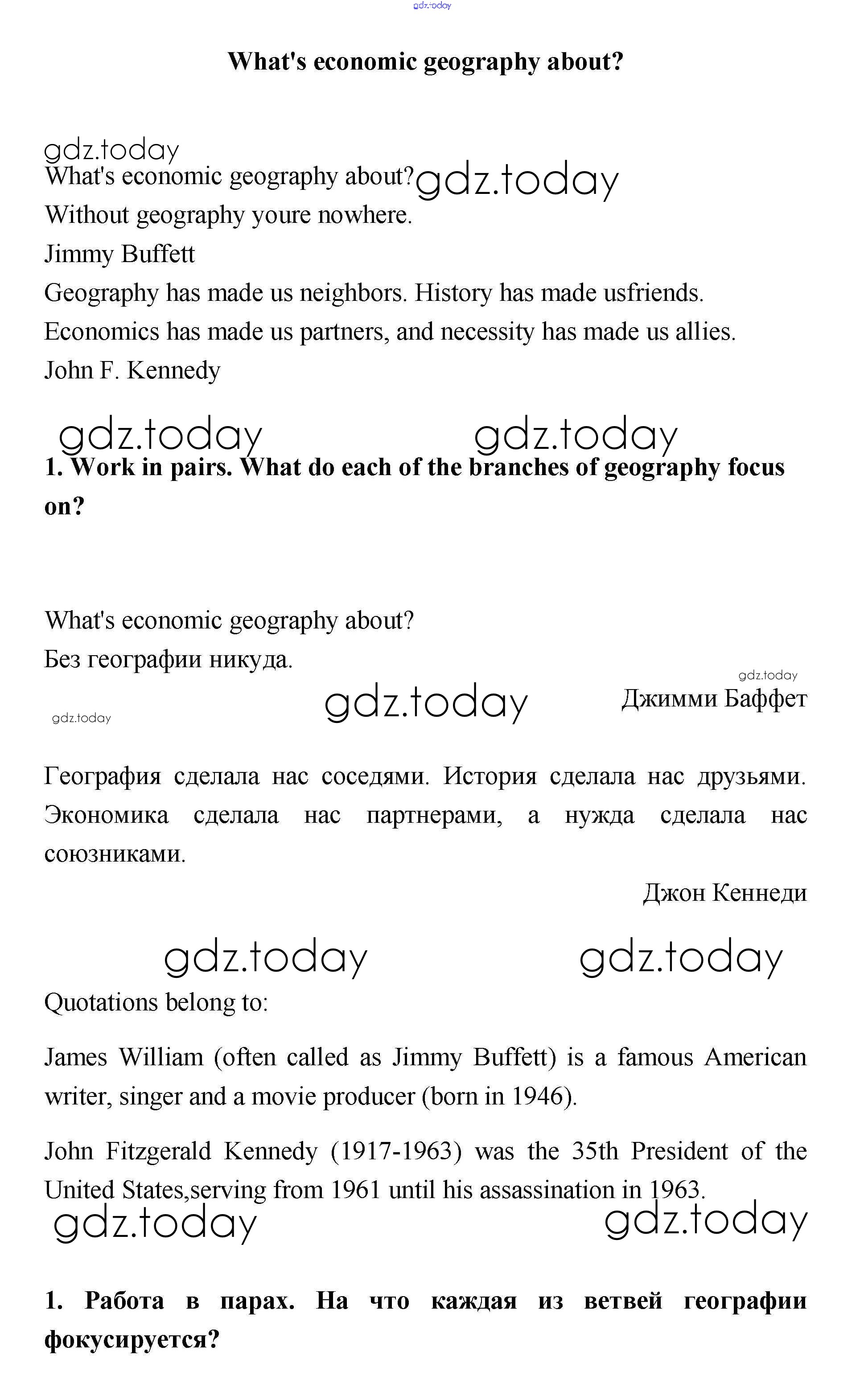 На страницах сайта gdz.today вы найдете учебный и вспомогательный материал, направленный на улучшения знаний школьной программы. ГДЗ - онлайн мир знаний What's economic geography about? Решение к School English 1 Учебнику по Английскому языку для 11 класса Биболетова, Трубанева Титул Enjoy English 2015