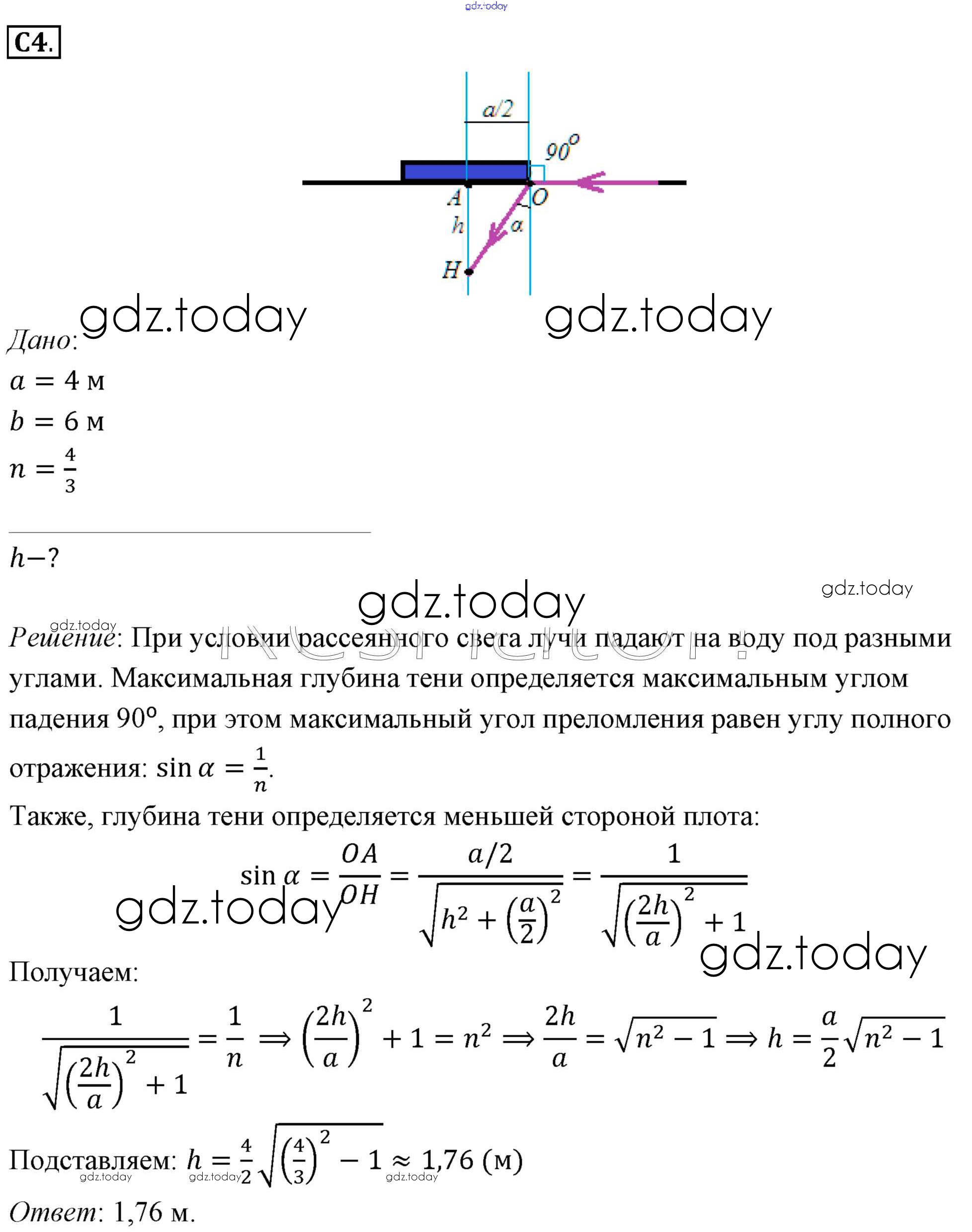 На страницах сайта gdz.today вы найдете учебный и вспомогательный материал, направленный на улучшения знаний школьной программы. ГДЗ - онлайн мир знаний Задания ЕГЭ Решение к §49. Примеры решения задач по теме «Закон преломления света. Полное отражение света» 4 Учебнику по Физике для 11 класса Мякишев, Буховцев Базовый уровень Просвещение 2018