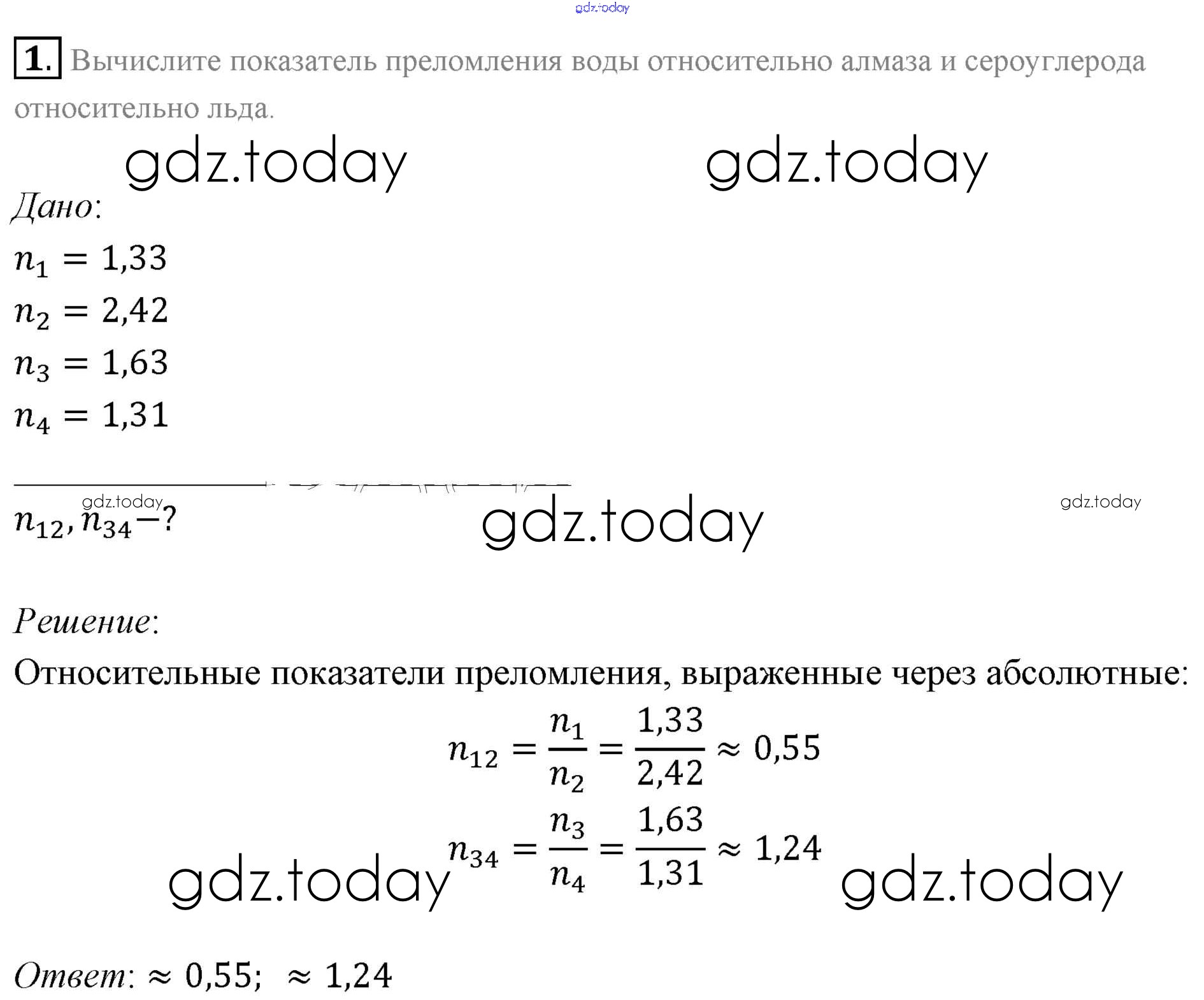 Решение к §49. Примеры решения задач по теме «Закон преломления света. Полное отражение света»